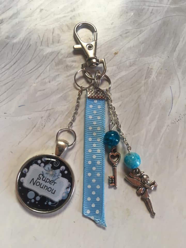 Porte clé ou bijou de sac pour une nounou couleur bleu.
