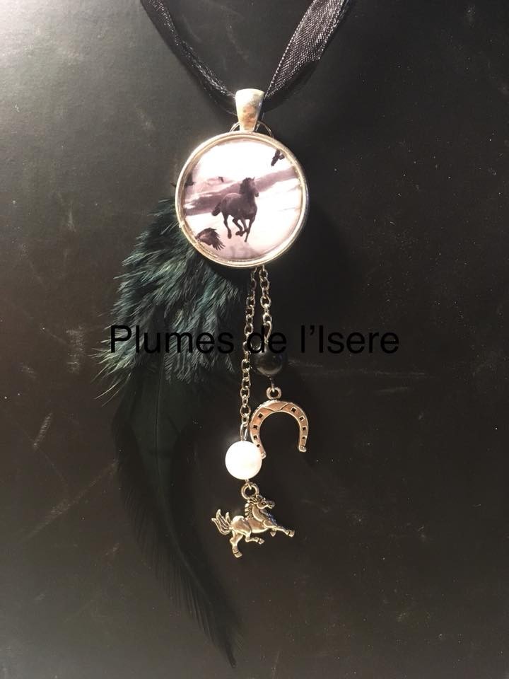 La plume est une plume de coq noire avec ses breloques et ses perles assorties.