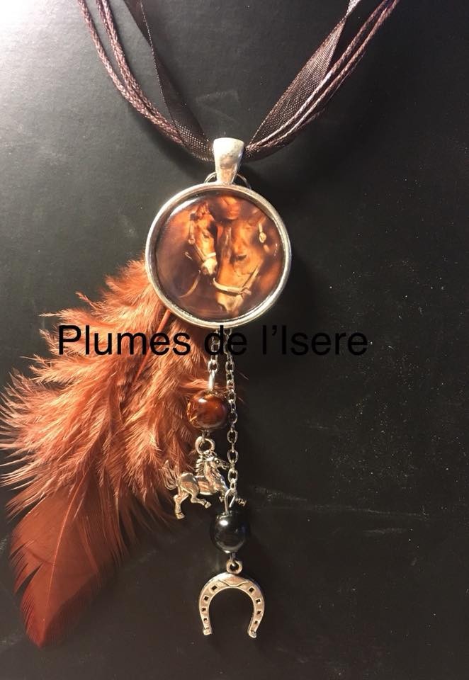 Le cabochon représente une jument avec son poulain qui se font un calin dans les teintes de marron. La plumes est une plume de coq marron avec ses perles et ses breloques assorties