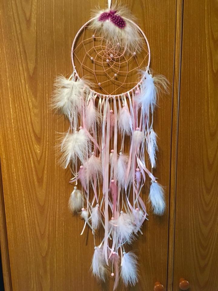 Attrape reve couleur rose clair et blanc. Diamètre du cercle 20cm pour une longueur totale d'environ 70cm.