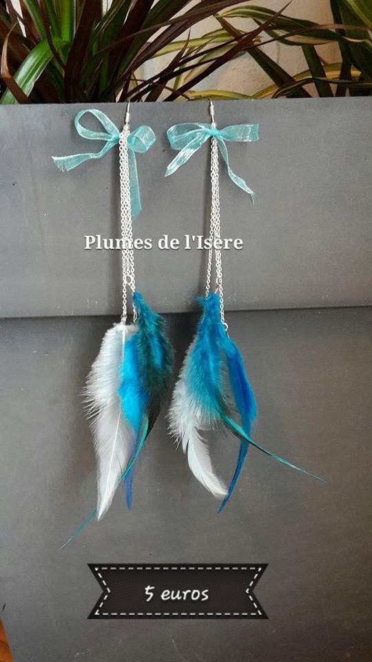 Paire de boucles d'oreilles pendantes. Petit noeud en organza bleu sur la base, chainette en metal argenté avec finition de trois plumes de coq blanc, bleu clair et turquoise.