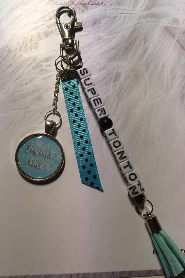 Porte clé ou bijou de sac pour offrir à un tonton pour Noel. Couleur bleu et noir.